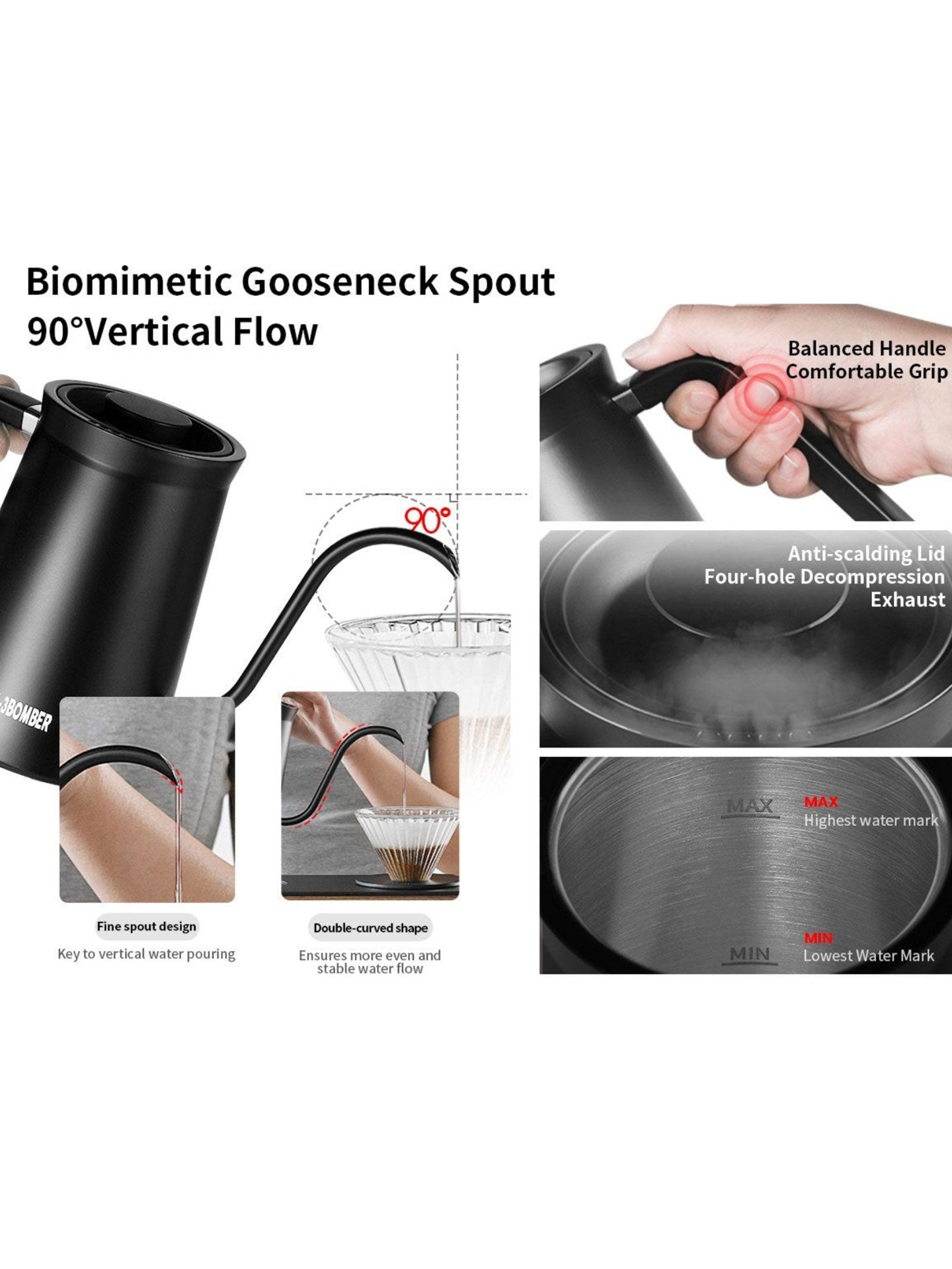 - INTIMATE CARE: The Electric Kettle with a gooseneck spout and 90°Vertical Flow, ensures the boiled water pouring at optimal pour-over flow rate. The kettle is made of BPA-free material and food-grade 304 stainless steel, no harmful substance will dissolve even at high temperature, just enjoy a pure taste and healthy life.