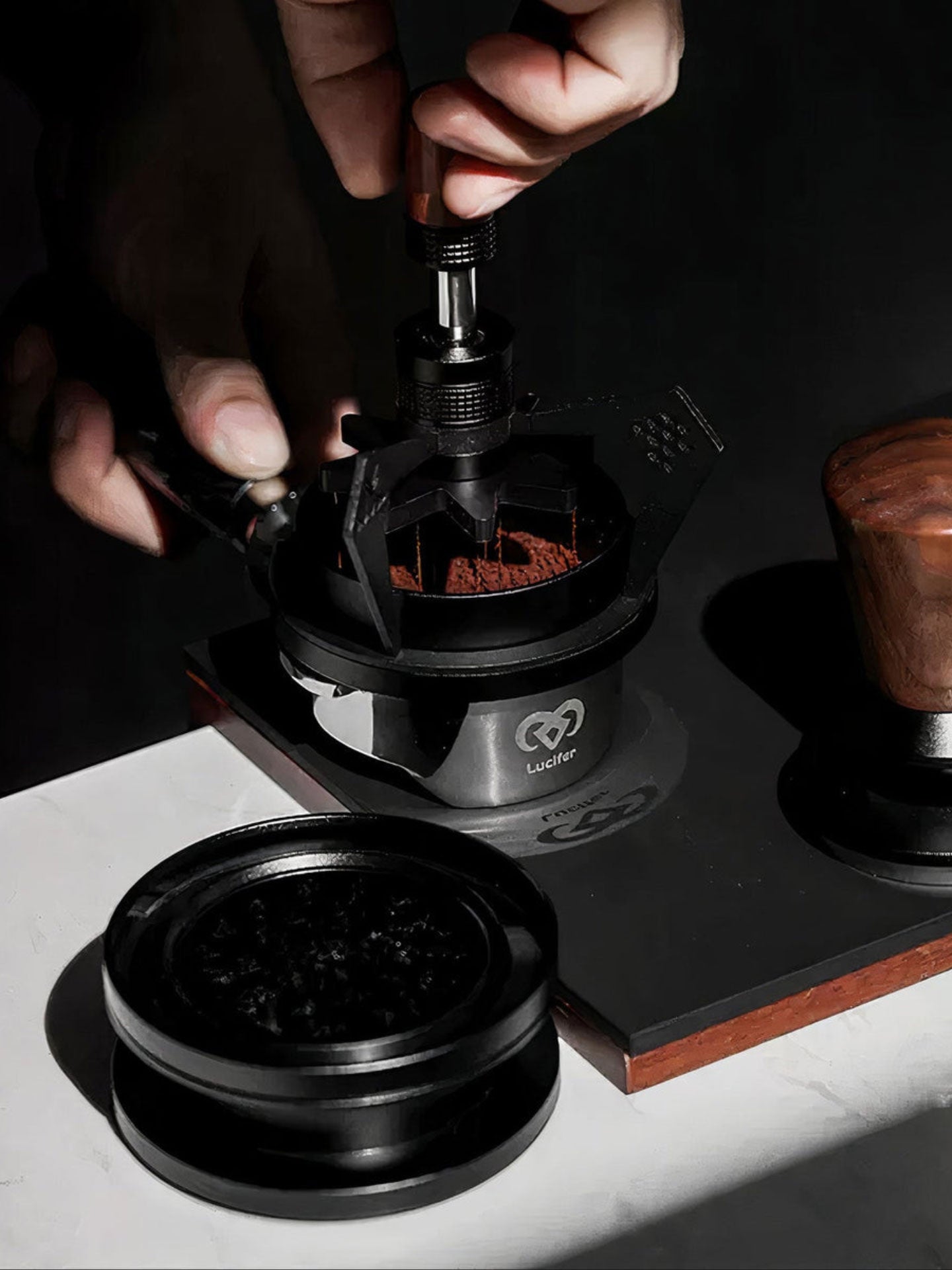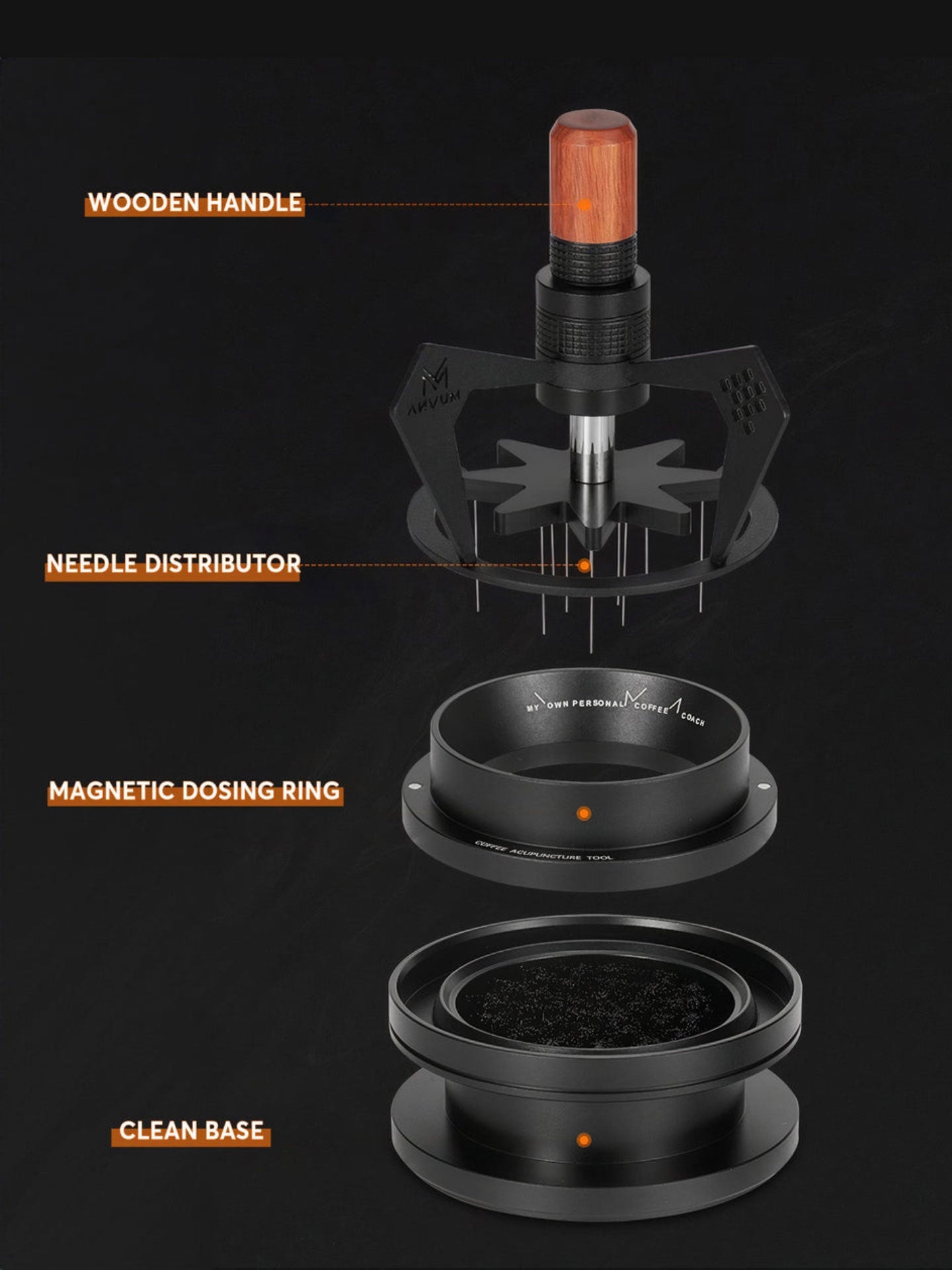 This tool enhances espresso preparation by improving coffee distribution for more consistent extraction. With Weiss Distribution Technique (WDT), it ensures uniformity, while the adjustable needle length accommodates various doses and basket sizes. Featuring a magnetic ring for secure attachment and geared spinning technology for smooth rotation, it efficiently disperses coffee grounds.