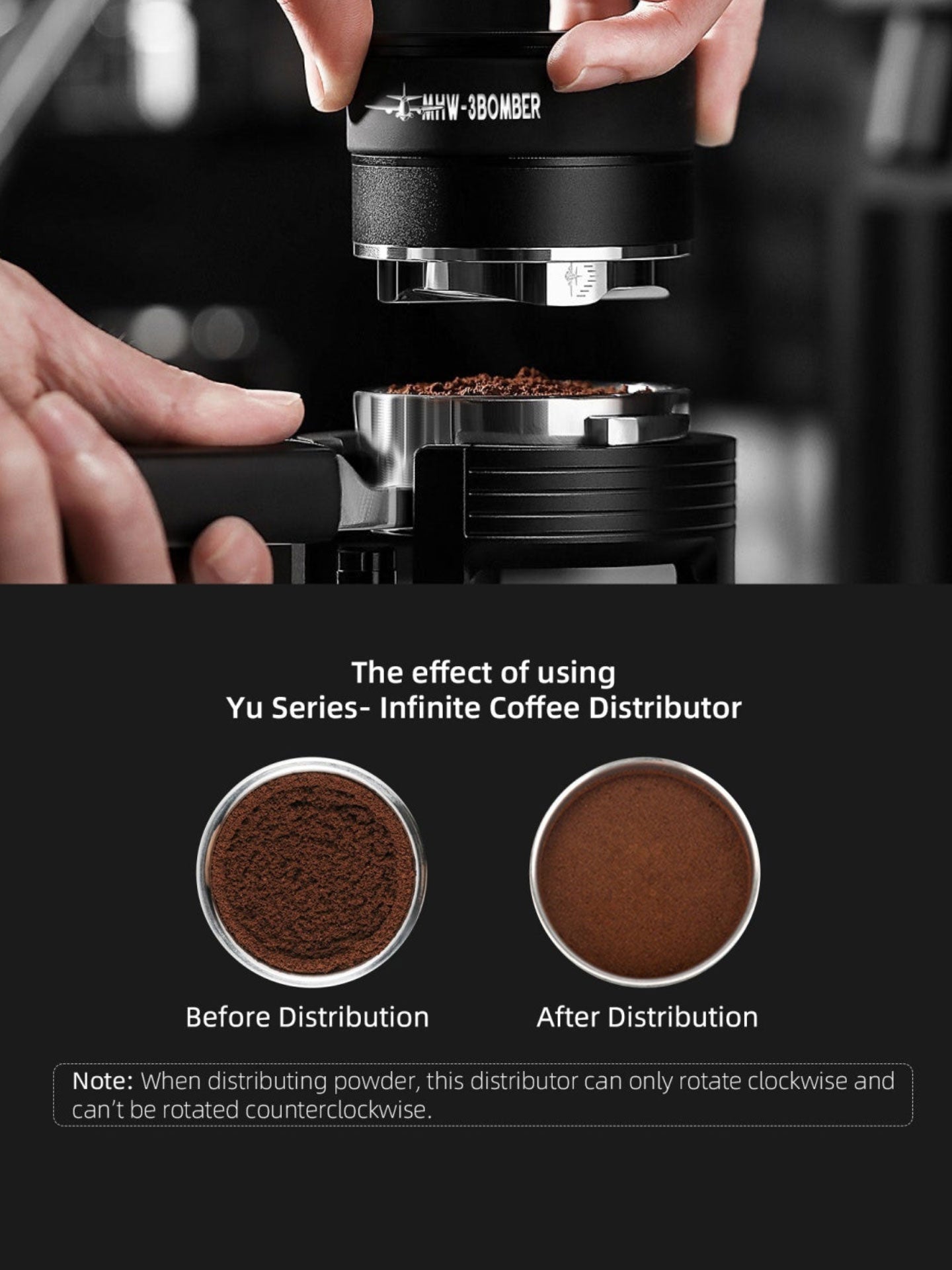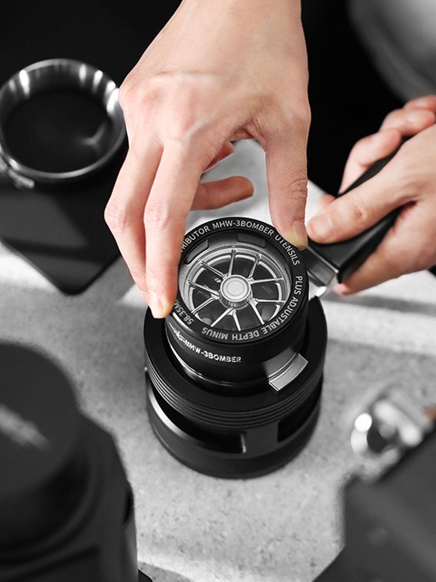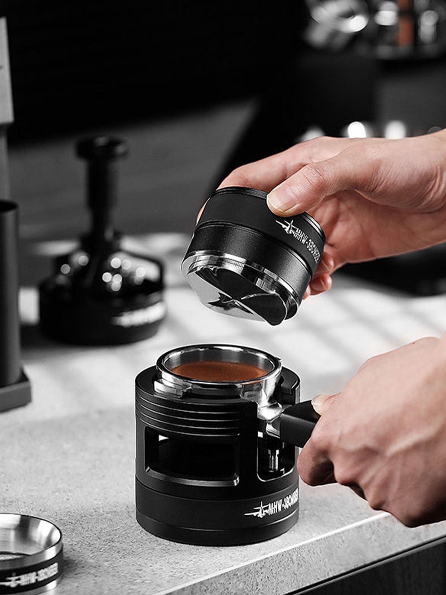 - Infinite Adjustment: This coffee distributor features a rotatable adjustment ring that allows users to effortlessly control the base height during filling, ensuring precise and accurate tamping. Moreover, the adjustment process is accompanied by audible feedback, aiding users in achieving optimal adjustments for an enhanced experience.